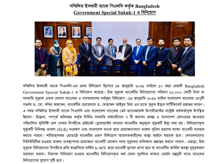 বাংলাদেশের ইসলামি ব্যাংকিং খাতে একটি গুরুত্বপূর্ণ মাইলফলক স্থাপিত হলো সম্মিলিত ইসলামী ব্যাংক পিএলসি-এর প্রথম বিনিয়োগের মাধ্যমে। ১৪ জানুয়ারি ২০২৬ তারিখে ব্যাংকটি তার কার্যক্রমের শুরুর দিনগুলিতে ১০ বছর মেয়াদি Bangladesh Government Special Sukuk-1-এ বিনিয়োগ করে, যা দেশের ব্যাংকিং ইতিহাসে একটি উল্লেখযোগ্য ঘটনা হিসেবে বিবেচিত হচ্ছে।