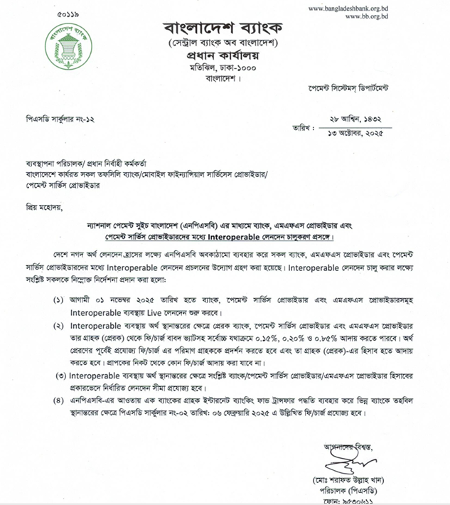 ১৩/১০/২০২৫ তারিখে পিএসডি সার্কুলার নং-১২ এর মাধ্যমে আগামী ০১ নভেম্বর ২০২৫ তারিখ হতে ন্যাশনাল পেমেন্ট সুইচ বাংলাদেশ (এনপিএসবি) এর মাধ্যমে ব্যাংক, এমএফএস প্রোভাইডার এবং পেমেন্ট সার্ভিস প্রোভাইডারদের মধ্য interoperable লেনদেন চালু করতে যাচ্ছে বাংলাদেশ ব্যাংক। এতে গ্রাহকের খরচ কমবে এবং সহজে সেবা পাওয়া সম্ভব হবে।